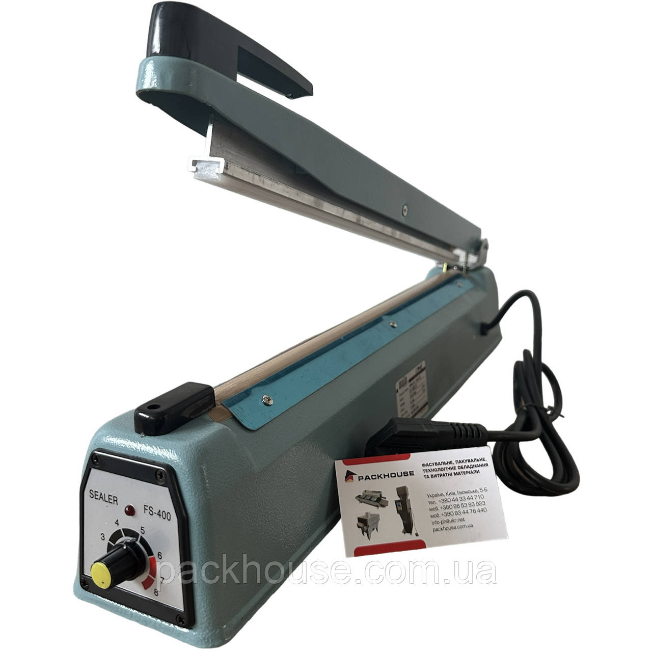 Настільний запайщик пакетів та плівок імпульсного нагріву, модель FS-400 (ФС-400), призначений для запаювання верхнього останнього шва упаковки (пакет, упаковка, мішок), заповненої харчової або технічної продукцією. Здатний працювати з будь-якими видами плівок: як одношарових так і багатошарових (ПП, ПНД, ПВД, ПЕ, ПВХ і ПОФ).